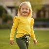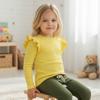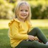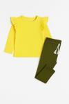 Üst kısmındaki fırfır detaylı uzun kollu sarı bluz, modern kesimiyle dikkat çekerken; bel kısmı ipli haki tayt, esnek yapısıyla maksimum konfor sunar.