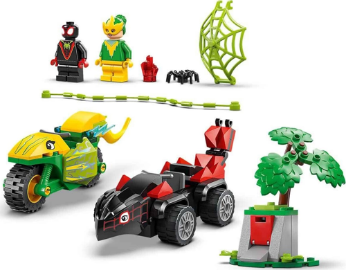 minifigürü ve 2 ittir-bırak dinozor aracı içerir: Stegosaurus arabalı Miles "Spin" Morales ve Dilophosaurus motosikletli Electro.
