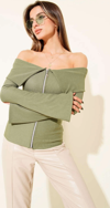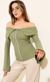 Omzu Açık Fermuarlı Bluz haki T4330, feminen ve şık bir görünüm arayan kadınlar için ideal bir seçenektir.