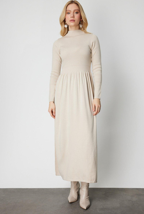 Detay: Triko kumaşıyla sıcak tutan ve astarsız yapısıyla hafiflik sunan bu uzun kollu elbise, dik yaka detayıyla modern ve zarif bir duruş sergiler. Günlük stilinize konfor katarken, sade şıklığıyla mevsim geçişlerinde ideal bir tercih olur;