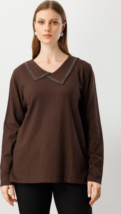 ON Kadın Büyük Beden Yakası Taşlı Triko Kazak 65395 Kahverengi