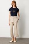 Detay: Yüksek bel tasarımıyla vücut hatlarını zarifçe vurgulayan bu dokuma pantolon, duble paça detayıyla modern ve şık bir duruş sergiliyor. Fermuarlı kapama özelliği sayesinde pratik bir kullanım sunarken, yan ceplerle hem fonksiyonellik hem de günlük rahatlık sağlanıyor. Günlük stilinizden ofis kombinlerine kadar geniş bir kullanım alanı sunan bu pantolon, sade tasarımıyla zamansız bir parça olarak öne çıkıyor;