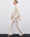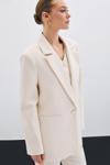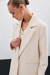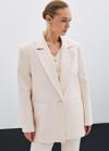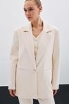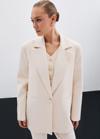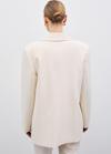 Kruvaze yaka, iç astarlı, düz uzun kol, kalça altı boy, süs cep, ön tek düğmeli salaş ceket.