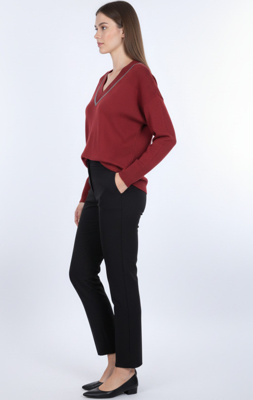 V yaka tasarımı, taş detaylarıyla zenginleştirilmiş bu kazak, her ortamda stil sahibi görünmenizi sağlar.