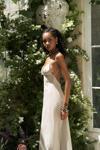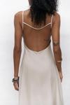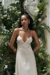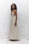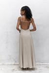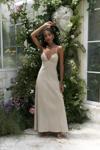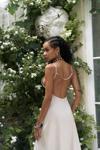 İnce askılı, V yakalı uzun sırt dekolteli elbise. Etek ucu geniş kesim. Astarlı.