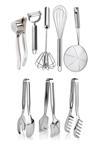Online Kapında'nın paslanmaz çelikten üretilmiş 8 parçalık pratik mutfak eşyaları seti, mutfakta ihtiyaç duyulan temel gereçleri bir araya getirir.