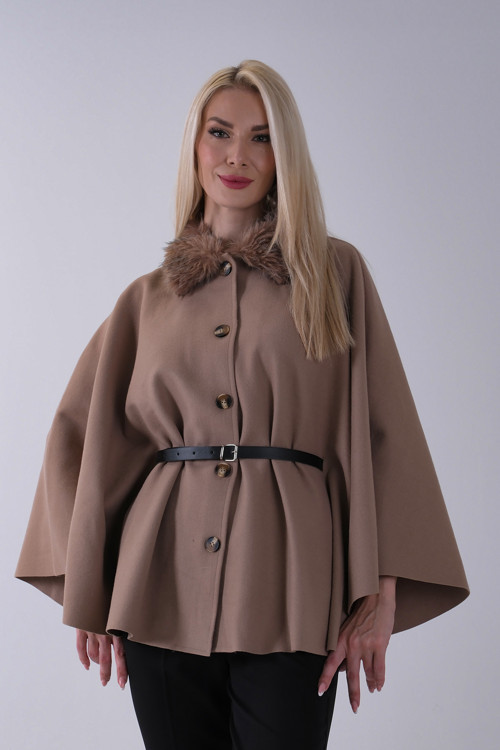 Önü Düğme Kapamalı Kemerli Yakası Kürklü Panço