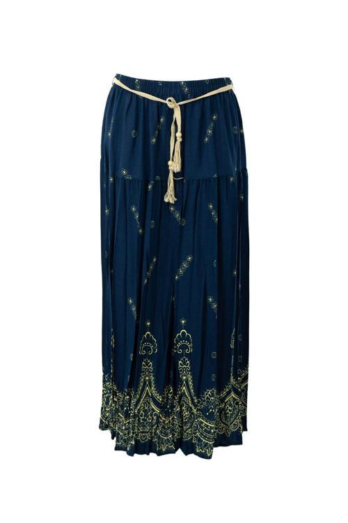 Oppland Kadın Bahar Etnik Desenli Beli Lastikli Ip Kemer Parçalı Tam Kalıp Dokuma Viskon Kumaş Etek Lacivert Standart