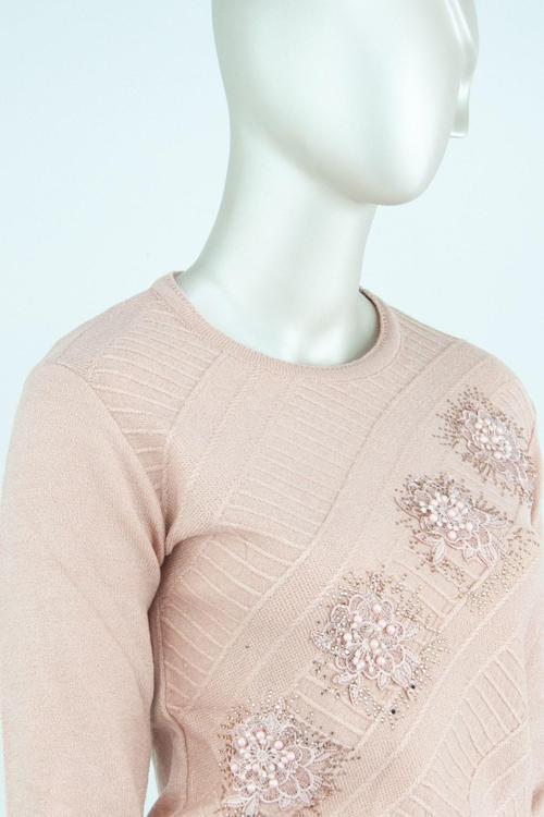 Kadın Kışlık Demet Motifli Boncuklu Ve Taşlı Likralı Kardelen Dokuma Genç Anne Triko Kazak Pudra Standart