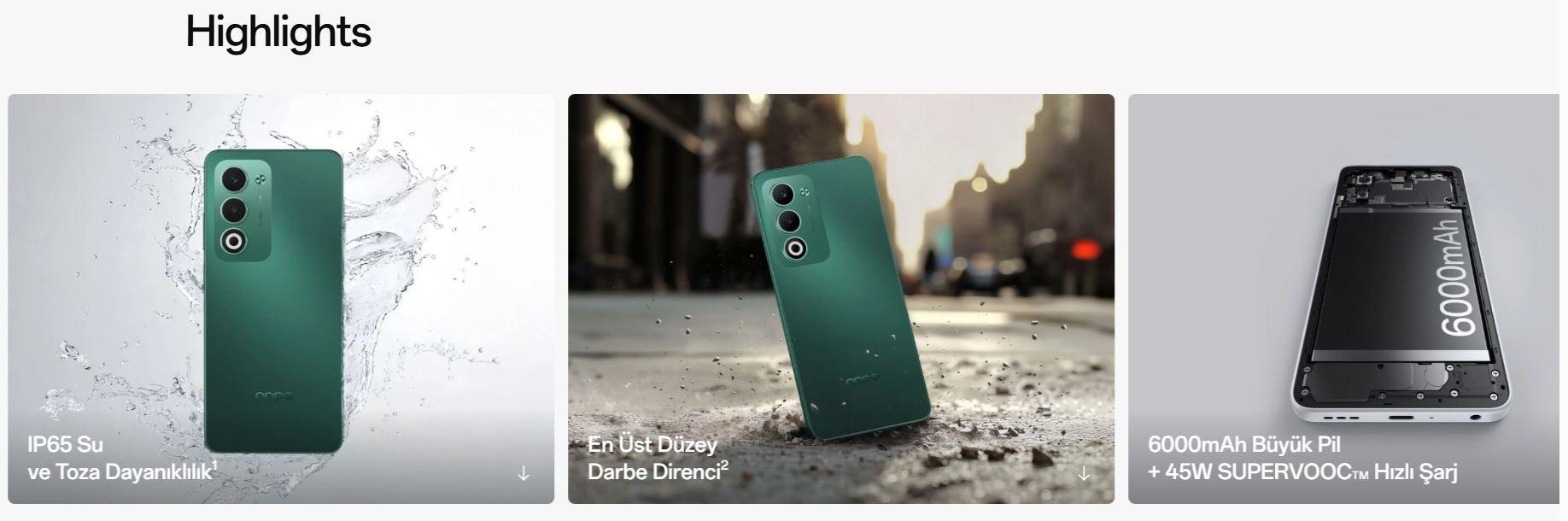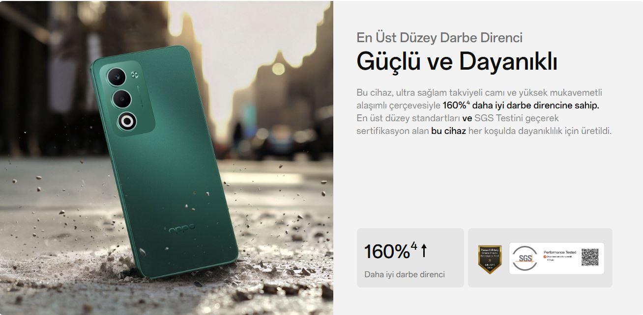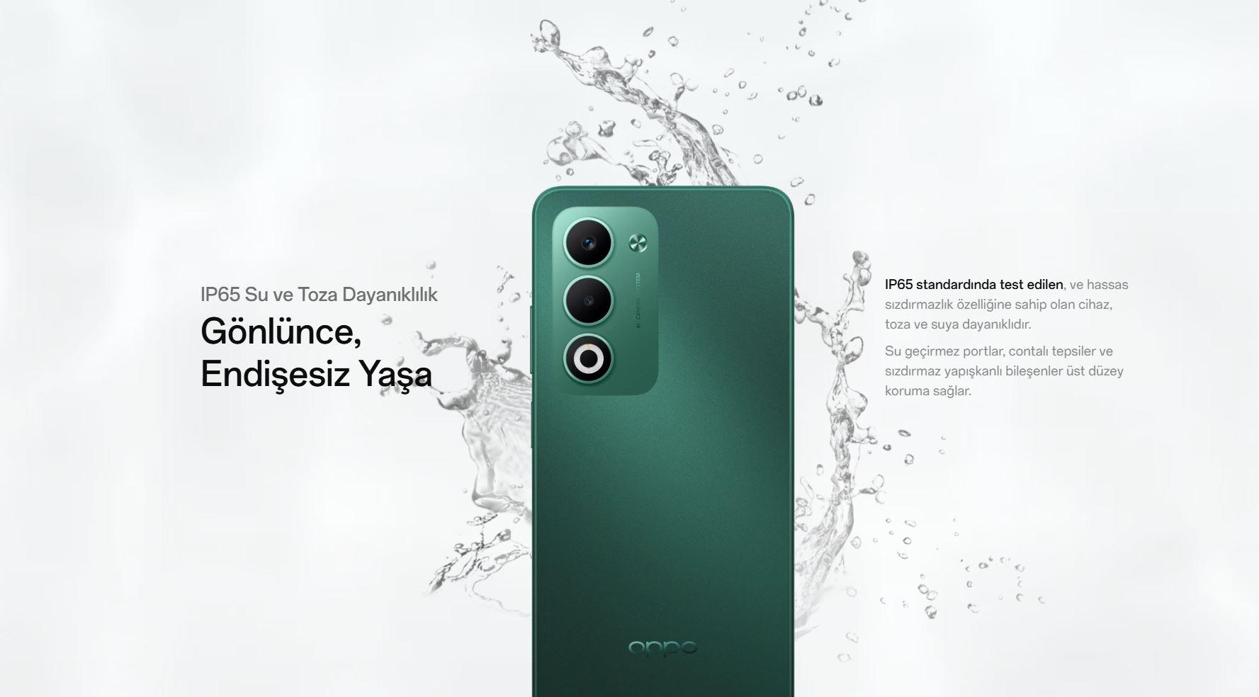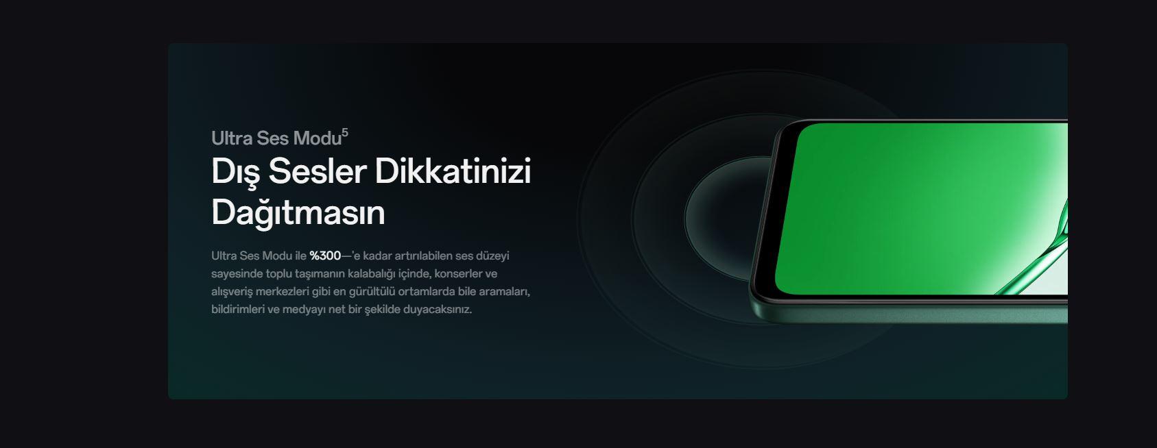 Bir Adım İleride IP65 Su ve Toza Dayanıklılık En Üst Düzey Darbe Direnci 6000mAh Büyük Pil + 45W SUPERVOOCTM Hızlı Şarj 120Hz Ultra Parlak Ekran Gönlünce, Endişesiz Yaşa IP65 standardında test edilen, ve hassas sızdırmazlık özelliğine sahip olan cihaz, toza ve suya dayanıklıdır. Su geçirmez portlar, contalı tepsiler ve sızdırmaz yapışkanlı bileşenler üst düzey koruma sağlar. Güçlü ve Dayanıklı Bu cihaz, ultra sağlam takviyeli camı ve yüksek mukavemetli alaşımlı çerçevesiyle 160%4 daha iyi darbe direncine sahip. En üst düzey standartları ve SGS Testini geçerek sertifikasyon alan bu cihaz her koşulda dayanıklılık için üretildi. Parlak, Akıcı, Keyifli Güneşte veya içeride olsun ortama uyum sağlayan ekran, yoğun ışık altında bile canlı ve parlak netlik sunuyor. Ultra akıcı görseller ve parlaklık için 120 Hz'e kadar yenileme hızıyla her izleme deneyimine ekstra canlılık ve berraklık kazandırıyor. Dış Sesler Dikkatinizi Dağıtmasın Ultra Ses Modu ile %300—'e kadar artırılabilen ses düzeyi sayesinde toplu taşımanın kalabalığı içinde, konserler ve alışveriş merkezleri gibi en gürültülü ortamlarda bile aramaları, bildirimleri ve medyayı net bir şekilde duyacaksınız.  6000mAh Büyük Pil Daha da İyi bir Pil Bu pil, ağırlık yapmadan şarjlar arasındaki süreyi uzatıyor. Yeniden tasarlanan yapısıyla verimliliği artırırken daha hızlı şarj ve daha az ısı sağlıyor. Beş yıl güvenilir kullanım için tasarlanan bu pil, orijinal kapasitesinin %80'ini koruyor.6 45W SUPERVOOCTM Hızlı Şarj7 Her Dakika Değerli Telefonunuzu sadece 21 dakikada %30 şarj edin. Hızlı bir konuşma yapmanıza veya parkta yürürken fotoğraf çekebilmenize yetecek. Yarım saatten biraz fazla sürede %50'ye kadar şarj edebilirsiniz8.Siz öğle yemeğinizi yerken telefonunuz şarj olsun.