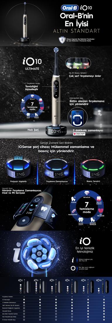 Devrim niteliğindeki iO Sense akıllı şarj cihazına sahip iO 10 şarjlı diş fırçası, diş fırçalamanızı gerçek zamanlı geri bildirimle kişiselleştirerek mükemmel koruma, diş fırçalama süresi ve diş fırçalama basıncı için size rehberlik eder. Her gün sansasiOnel bir arındırıcı temizlik hissi için, nazik mikro titreşimleri diş hekimlerinden ilham alan benzersiz yuvarlak fırça başlığıyla birleştirir. En iyi sonuç için Oral-B iO diş fırçası başlığınızı 3 ayda bir değiştirin.