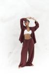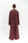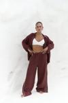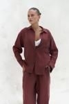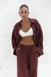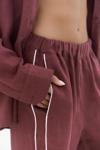 %100 keten, yakalı gömlek. Uzun kollu, önü düğme kapamalı. Elastik belli, yüksek bel, yan çizgi şerit detaylı keten karışımlı pantolon. Yanları cepli.