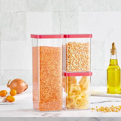 Üçlü set halinde sunulan saklama kabı, mutfakta düzeni ve pratikliği bir arada sunar