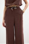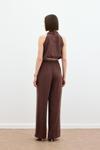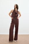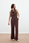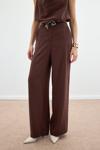 Yüksek bel, cepli, geniş paça, ön fermuarlı ve kancalı, örgü kemerli pantolon.