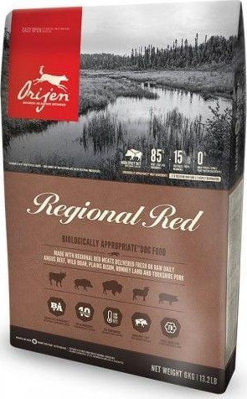 ORIJEN REGIONAL RED Alberta çiftliklerinde yetişen ve TAZE veya ÇİĞ olarak teslim edilen Angus sığırı, yaban domuzu, Ova Bizonu, Romney kuzusu ve Yorkshire domuzunu WholePrey™ oranlarında birleştirerek köpeğinizi tam manasıylanbsp; besler.