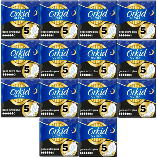 Orkid ultra Gece extra Plus 5 Boy 5'lİ x 14 Paket, Ürün toplamda 70 Adet ped. Anında kuruluk ıslaklığı hapseder.Sızıntı kalkanı sızıntıları hapseder.