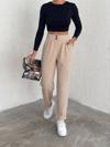 Kazax marka örme krep pantolon çift düğmeli modeli, şıklığı ve konforu bir arada sunar.