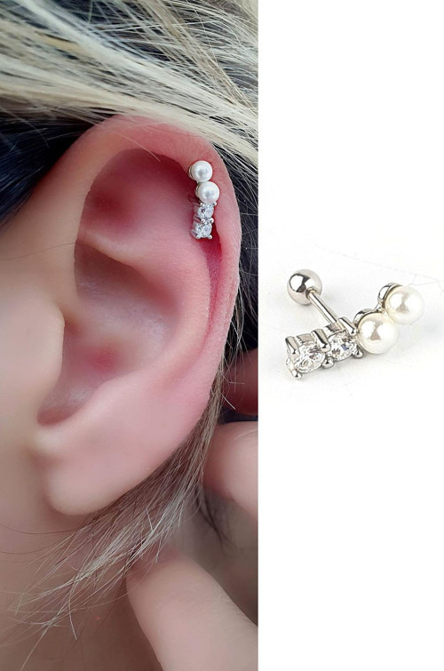 Zirkon Taş Detaylı İncili 925ayar Gümüş Tragus Kıkırdak Helix Piercing