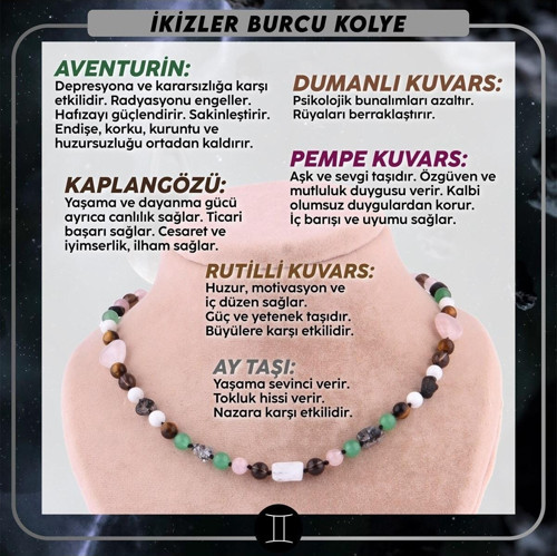Osmanlı Değerli Taş Ikizler Burcu Kolye-Kaplan Gözü-Ay Taşı-Yeşim-Pembe Kuvars-Kırmızı Akik-Güneş Taşı