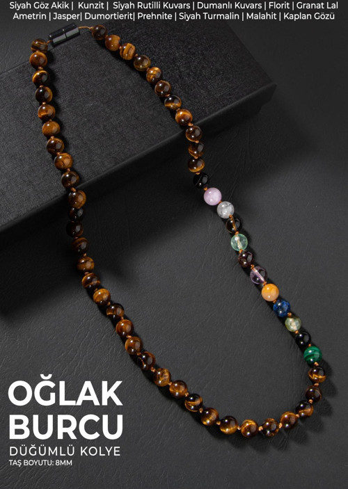 Oğlak Burcuna Özel Düğümlü Kolye Sertifikalı Doğal Taşlı (Malahit, Granat Lal, Turmalin, Kunzit, Kaplan Gözü) Oğlak Burcunun Doğal Taşlarından Özenle İşlenmiş Düğümlü Kolye %100 Orijinal Sertifikalı Doğal Taşlar TAŞ BOYUTU:8MM TAŞLAR: Siyah Göz Akik | Kunzit | Siyah Rutilli Kuvars | Dumanlı Kuvars | Florit | Granat Lal| Ametrin | Jasper | Dumortierit | Prehnite | Siyah Turmalin | Malahit | Kaplan Gözü Kolyenin Faydaları: