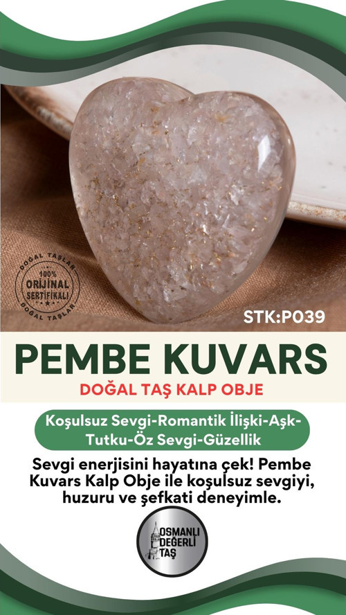 Osmanlı Değerli Taş Sertifikalı Pembe Kuvars Doğal Taş Kalp Obje P039