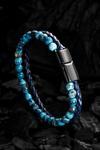 Osmanlı Gümüş Erkek Doğal Taş Bileklik - Damarlı Mavi Akik Taşı Boncuk Ve Örme Deri Erkek Bileklik