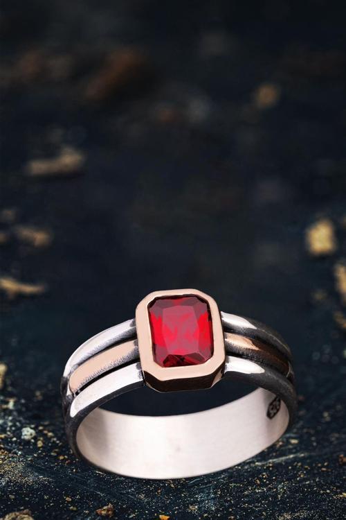Erkek Gümüş Yüzük - Kırmızı Yakut Taşlı Ince Kibar Erkek Yüzüğü
