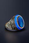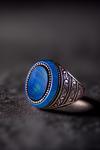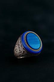 Osmanlı Gümüş Erkek Kehribar Detaylı Mavi Kaplan Gözü Taşı 925 Ayar Gümüş Yüzük