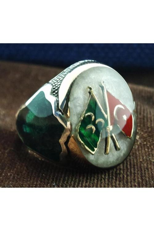 925Ayar Bayraklı Ve Üç Hilalli Mineli Lüks Gümüş Erkek Yüzük Özel Tasarım Ve İşçilik Koleksiyonluk Bir Model Ayar Damgalı Ve Faturalı Ağırlık: 13-14gr Üst Genişlik: 2,2x1,8cm Tüm Ürünler Özel Osmanlı Gümüş Kutusu ile Gönderilmektedir.