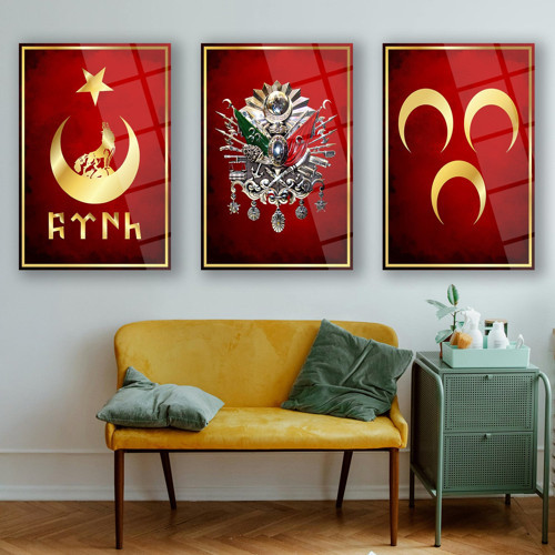 Osmanlı tarihinin güçlü sembollerini bir araya getiren bu özel 3’lü cam tablo seti, estetik tasarımı ve anlamlı kompozisyonuyla dikkat çeker. Set içerisinde Osmanlı arması, üç hilal sembolü ve Türk kültürünü temsil eden ay yıldız ile bozkurt figürü yer almaktadır. Kırmızı zemin üzerinde altın tonlu detaylarla hazırlanan tasarım, tarihi ve kültürel mirası modern dekorasyon anlayışıyla buluşturur.