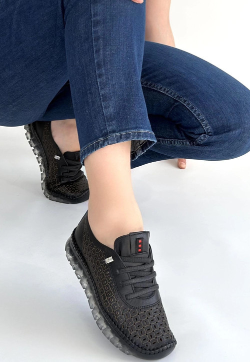 Otja Siyah Deri Lazerli Bağcıklı Spor Ayakkabı