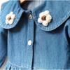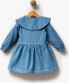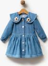 A-line kesimi ile rahat hareket etme özgürlüğü sunan kız çocuk yaka detaylı uzun kol kot elbise, şık ve modern bir görünüm sağlar.