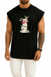 Oversize Kuş Ve Çay Fincanı, Çay Fincanı Havlu Çaydanlık Göğüs Tasarımlı Atlet