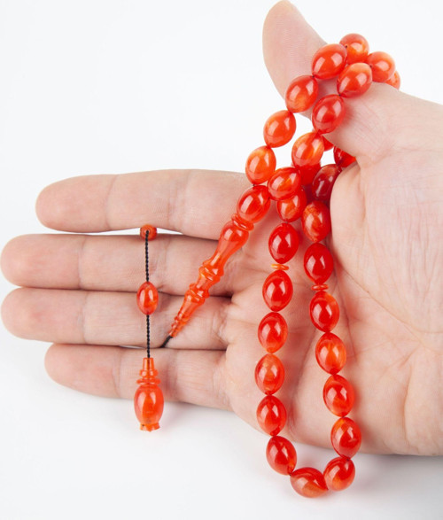 Özel Seri Orijinal Sedefli Sıkma Kehribar Beyzi Kesim 9x12mm Tesbih