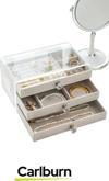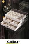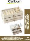 Üç Katlı Takı Organizeri, üç katlı çekmeceli tasarımı ile farklı türdeki takıların (yüzük, küpe, kolye, bileklik vb.) ayrı ayrı saklanmasına olanak tanır. Kadife kaplı iç bölmeler, takıların çizilmesini önler ve şık bir sunum sağlar. Saydam akrilik dış kapak, tozlanmayı engellerken içeriğin kolayca görünmesini sağlar. Kristal görünümlü çekmece kulpları ise dekoratif bir detay olarak tasarıma zarafet katar. Çok gözlü iç yapısı, küçük aksesuarların karışmadan düzenli bir şekilde durmasını sağlar. Bu düzenleyici kutular, hem evde takı organizasyonu sağlamak hem de makyaj masası veya komodin üzerinde dekoratif bir görünüm oluşturmak için idealdir.