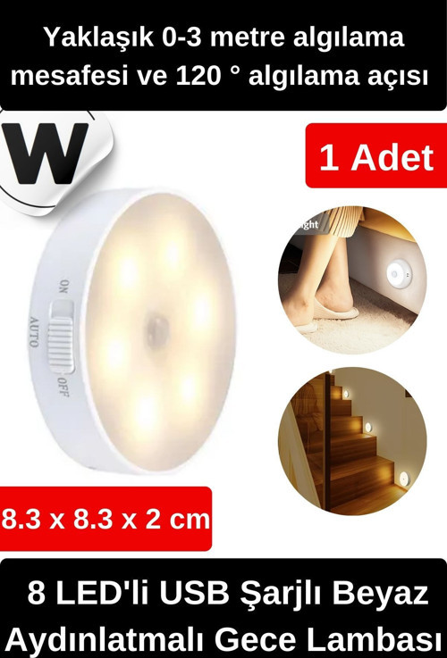 Wonara Özel Tasarım Mıknatıslı 3 Modlu Hareket Sensörlü 8 LED'li USB Şarjlı Beyaz Aydınlatmalı Gece Lambası