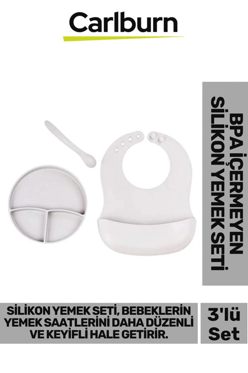 Carlburn Özel Üretim BPA İçermeyen Kaymaz Önlük Diş Kaşıyıcı Kaşık Vakumlu Tabak 3’lü Silikon Gri Yemek Seti