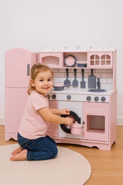 Birinci sınıf çamsan marka MDF den imal edilmiştir.vida kullanılmamış olup Keskin kısım bırakılmamistir.Çocuk sağlığa zararsız su bazlı akrilik boya ile 2 kat boyama yapılmıştır. Ürün rengi olarak bebek pembe ve beyaz detaylar antrasit gri renk kullanılmıştır. Mutfak ölçüleri 103 cm yükseklik,82 cm genişlik,32 cm derinlik mevcuttur.buzdolabi ölçüleri 103cm yükseklik, 30 cm genişlik,30 cm derinlik mevcuttur.