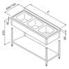 | AÇIKLAMA | * Ürün konstrüksiyonu paslanmaz çelikten mamuldür * Ürün demontedir * Üst tabla alınları 40 mm ve sırt 60 mm * Üst tabla pres baskı imal edilip bölgesel indirimli * Üst tablaya 3 adet 500x400x250 mm ölçülü pres baskı monoblok evye gözü dikiş kaynak yöntemiyle kaynaklı * Tezgah ayakları 40x40 kutu profil * Paslanmaz çelik taban raflı * Ayarlanabilir plastik rotil ayaklı |