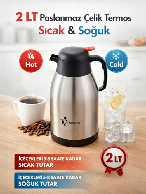 2 litre kapasiteli çift kat paslanmaz çelik çay termosu, içeceklerinizi uzun saatler boyunca ideal sıcaklıkta muhafaza eder. Vakumlu çift katmanlı izolasyon sistemi sayesinde çay, kahve ve sıcak içecekleri 5–8 saat, soğuk içecekleri ise 5–8 saat boyunca korur.
