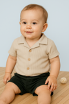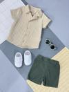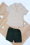 Takımın üst parçası, kabartmalı çizgili dokusuyla dikkat çeken, doğal bej tonlarında kısa kollu pamuklu bir gömlektir. Alt parça ise yumuşacık dokulu yeşil şort ile tamamlanmıştır. Günlük kullanım için ideal olan bu takım, hem evde hem dışarıda konforla hareket etmesini sağlar.