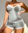 🌙🤍 Pamuklu Dantel İşlemeli Gri Askılı Şortlu Pijama Takımı