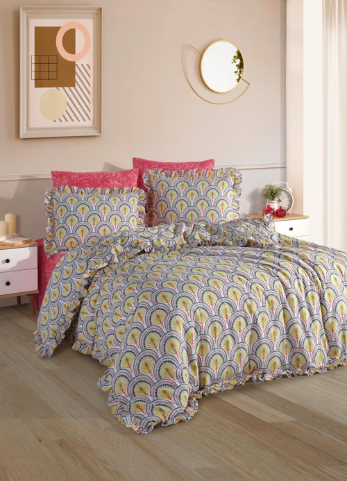 Retro Yelpaze Deseni ile tasarlanan pamuklu fırfırlı çift kişilik nevresim seti, yatak odanıza enerjik ve şık bir görünüm kazandırır. Sarı, mavi ve kırmızı tonlarının uyumlu kombinasyonu modern ve bohem dekorasyonlara kolayca uyum sağlar.
