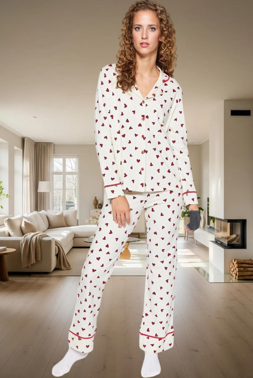 Kış aylarının vazgeçilmez rahatlığı ve şıklığı için tasarlanan bu bej pamuklu pijama takımı, %100 pamuktan üretilmiştir. Cildinizde yumuşacık bir his bırakan kumaşıyla gün boyu konfor sunar. Sevimli kalpli deseni, pijama takımınıza neşe ve şirinlik katar. Regular kalıbı ile her vücut tipine rahatça uyar ve hareket kısıtlaması yaşamazsınız. Uzun kolları ve uzun paçaları sayesinde soğuk kış akşamlarında sıcak ve rahat kalırsınız.