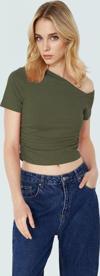 Nefes alabilen pamuklu örme kumaştan üretilen bu beyaz bluz, yaz aylarında serin ve rahat kalmanıza yardımcı olacak. Asimetrik yakası ve crop boyuyla modern ve şık bir görünüm sunarken, düşük kol detayıyla da rahatlığı bir araya getiriyor. Cepsiz tasarımıyla minimalist bir tarz yakalarken, büzgü detayı bluza hareket katıyor. Düz kalıbıyla her vücut tipine uyum sağlayan bu bluz, günlük yaşamınızda rahatlıkla kullanabileceğiniz bir seçenek. Jean pantolon, şort veya eteklerle kombinleyerek dilediğiniz tarzı yaratabilirsiniz.