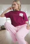 Evde rahatlığın ve şıklığın keyfini çıkarın! Bu iki parçalı pijama takımı, yumuşak 100% pamuk örme kumaştan üretilmiştir ve gün boyu rahatlık sunar. Bordo rengi ve galaksi deseniyle göz alıcı bir görünüme sahiptir. Regular kalıbı sayesinde her vücut tipine uyum sağlar. Kısa kollu üst ve boru paça pantolon, mükemmel bir uyum sağlar. Cep detayı, pratik bir kullanım sunar.