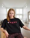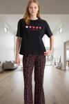 Yumuşak, nefes alan %100 pamuktan üretilen bu iki parçalı pijama takımı, evde huzurlu ve rahat vakit geçirmeniz için tasarlandı. Siyah zemin üzerine serpiştirilmiş kalpli desenleri ve 'Love' yazılı detayı ile şık ve modern bir görünüme sahiptir. Kısa kollu üstü ve rahat regular kalıbıyla gün boyu konfor sunar. Bisiklet yakası ile rahat ve şık bir uyum yakalayan bu pijama takımı, ilkbahar ve sonbahar aylarında idealdir.
