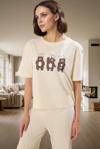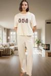 Yüksek kaliteli 30/1 openend süprem dokuma tipi pamuk kumaştan üretilen bu pijama takımı, nefes alabilir ve yumuşaktır. Parça baskı tekniğiyle uygulanan eğlenceli desen, pijamanıza şıklık katar. Normal beli ve rahat kesimiyle gün boyu konfor sunar. Kolay bakım gerektiren kumaşı, zaman kazandırır ve pratik kullanım sağlar.