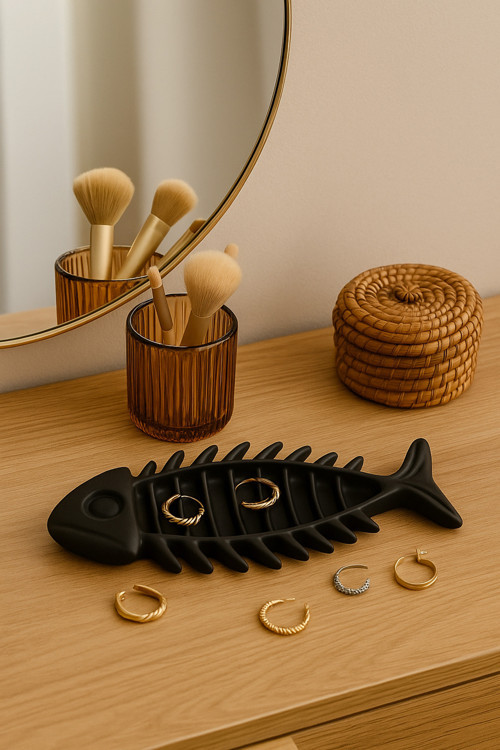 Şık ve modern tasarımlı balık figürlü takı organizeri, kolye, küpe, bileklik ve yüzükleriniz için estetik bir düzen sunar.