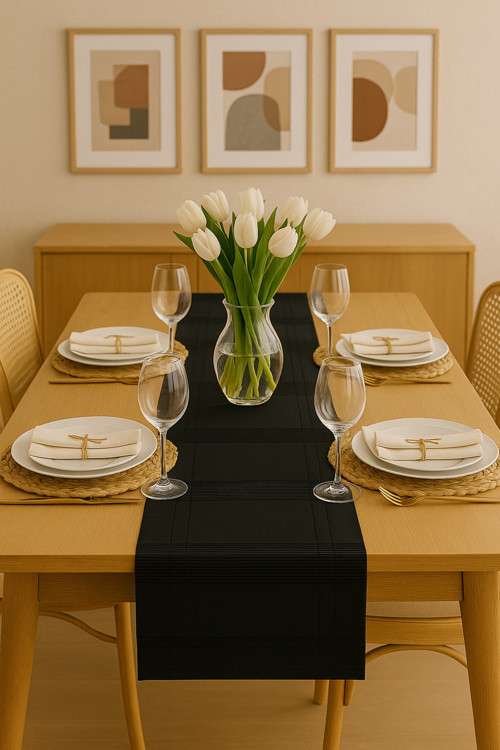 Jasmin Keten Siyah Bohem Şık Masa Örtüsü Runner 35X150 Cm